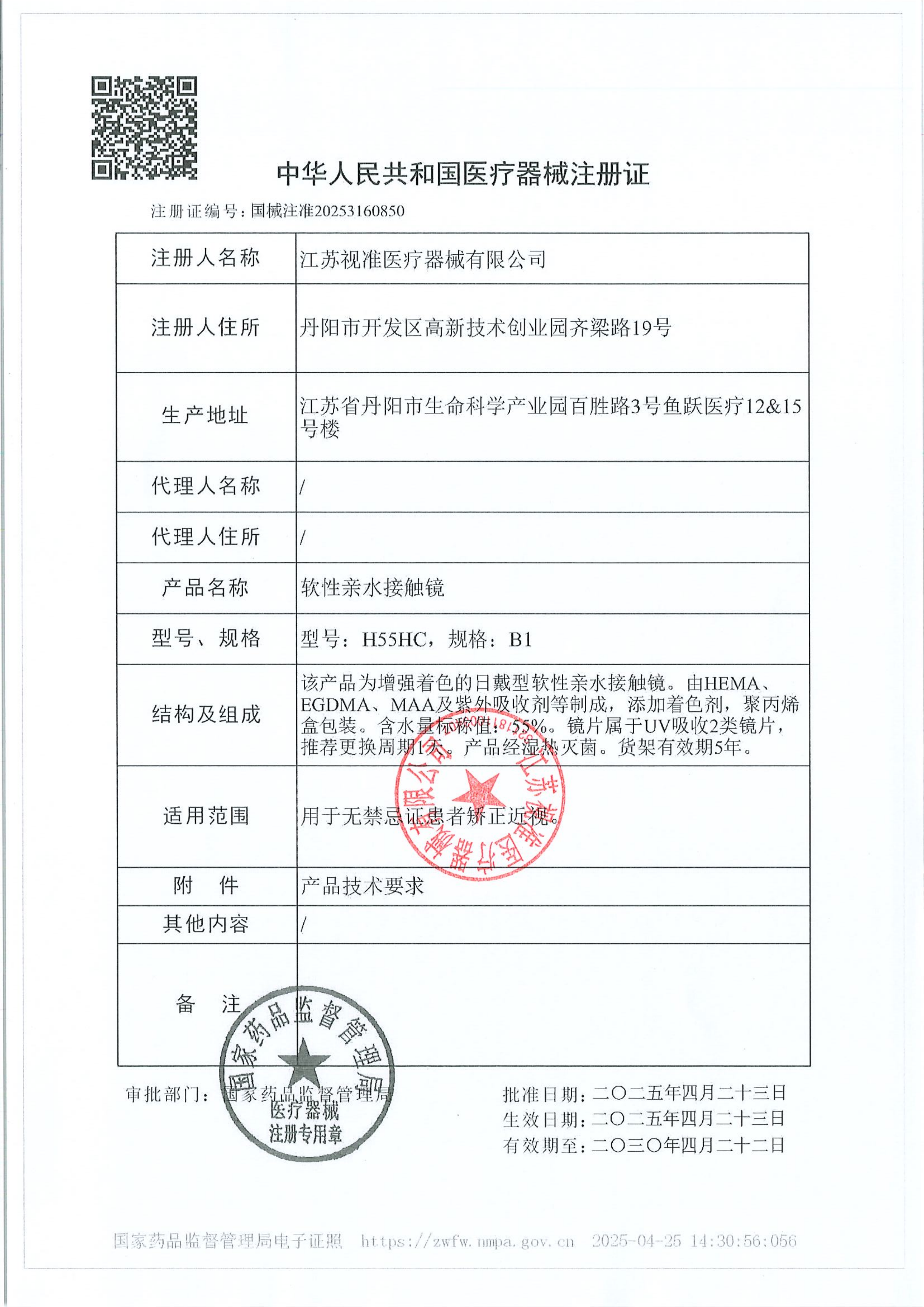 产品注册证:国械注准20253160850